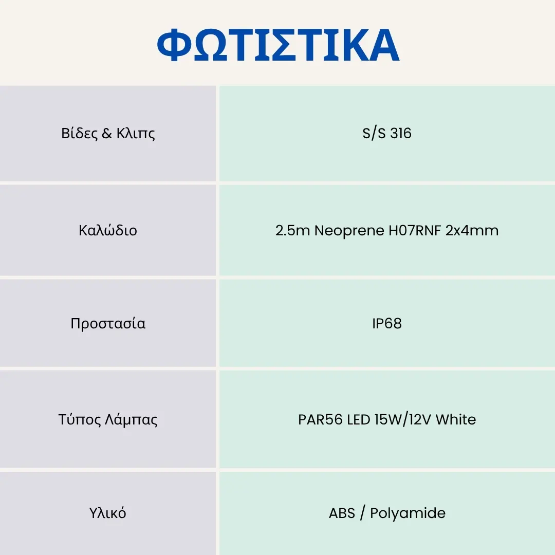 Το υποβρύχιο φωτιστικό πισίνας LED ψυχρού λευκού είναι πλήρες και κατάλληλο για πισίνες liner ή προκατασκευασμένες. Περιλαμβάνει εξωτερική φωλιά για liner, εσωτερική βάση λάμπας και πλαστικό στρογγυλό πρόσωπο που στερεώνεται με ανοξείδωτα clips. Η φωλιά έχει 16 ορειχάλκινα παξιμάδια και είσοδο καλωδίου από πλάι ή πυθμένα. Ισχύς 15W/12V.